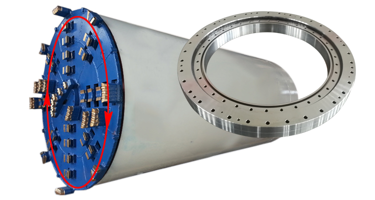 頂管機(jī)主要由旋轉(zhuǎn)挖掘系統(tǒng)、主頂液壓推進(jìn)系統(tǒng)、泥土輸送系統(tǒng)、注漿系統(tǒng)、測量設(shè)備、地面吊裝設(shè)備和電氣系統(tǒng)等組成。我公司生產(chǎn)的頂管機(jī)專用三排圓柱滾子轉(zhuǎn)盤軸承(回轉(zhuǎn)支承)用于旋轉(zhuǎn)挖掘系統(tǒng)中的切削刀盤。